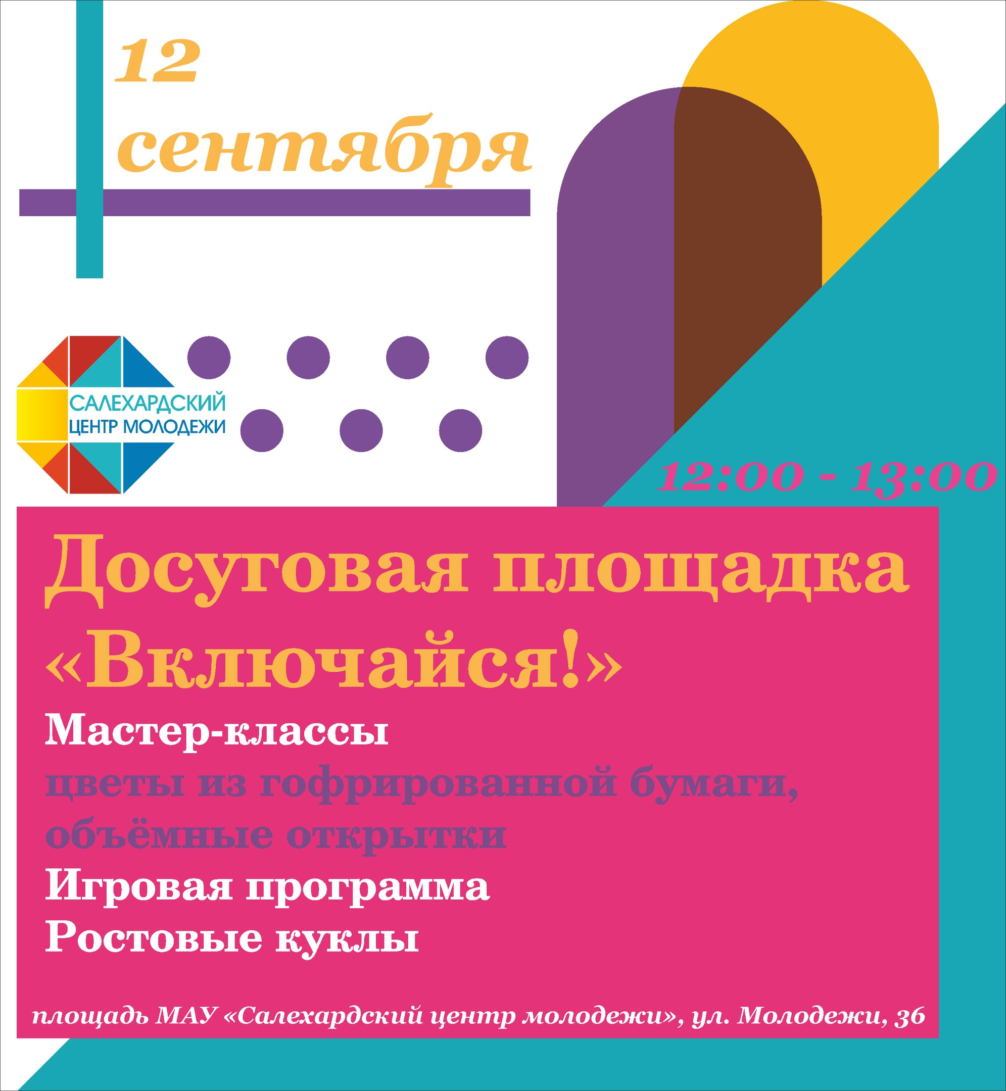 Дорогие дети и их родители! Приглашаем Вас на досуговую площадку «Включайся!». 12 сентября в 13.00 на территории Салехардского центра молодежи пройдет развлекательная программа: мастер-классы, конкурсы, игры, эстафета и многое другое. Скучать Вам не дадут веселые ростовые куклы!