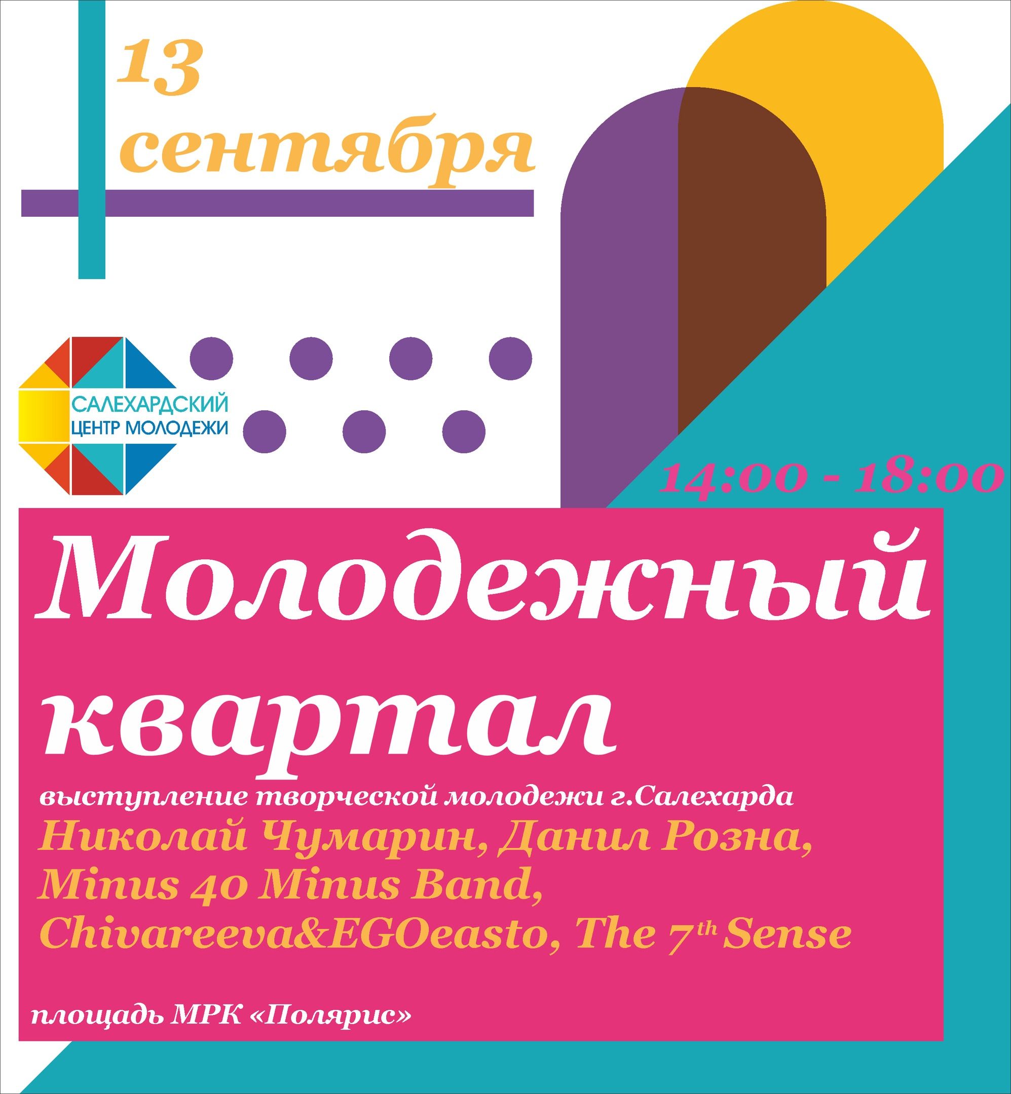 «Молодежный квартал» – это творческая площадка, где молодые исполнители Николай Чумарин, Данил Розна, Кавер группа Minus 40 band, танцевальная команда «The 7th Sense», Chivareeva & EGOeasto представят свое мастерство в танцах, исполнение песен, чтении рэпа, игре на музыкальных инструментах.